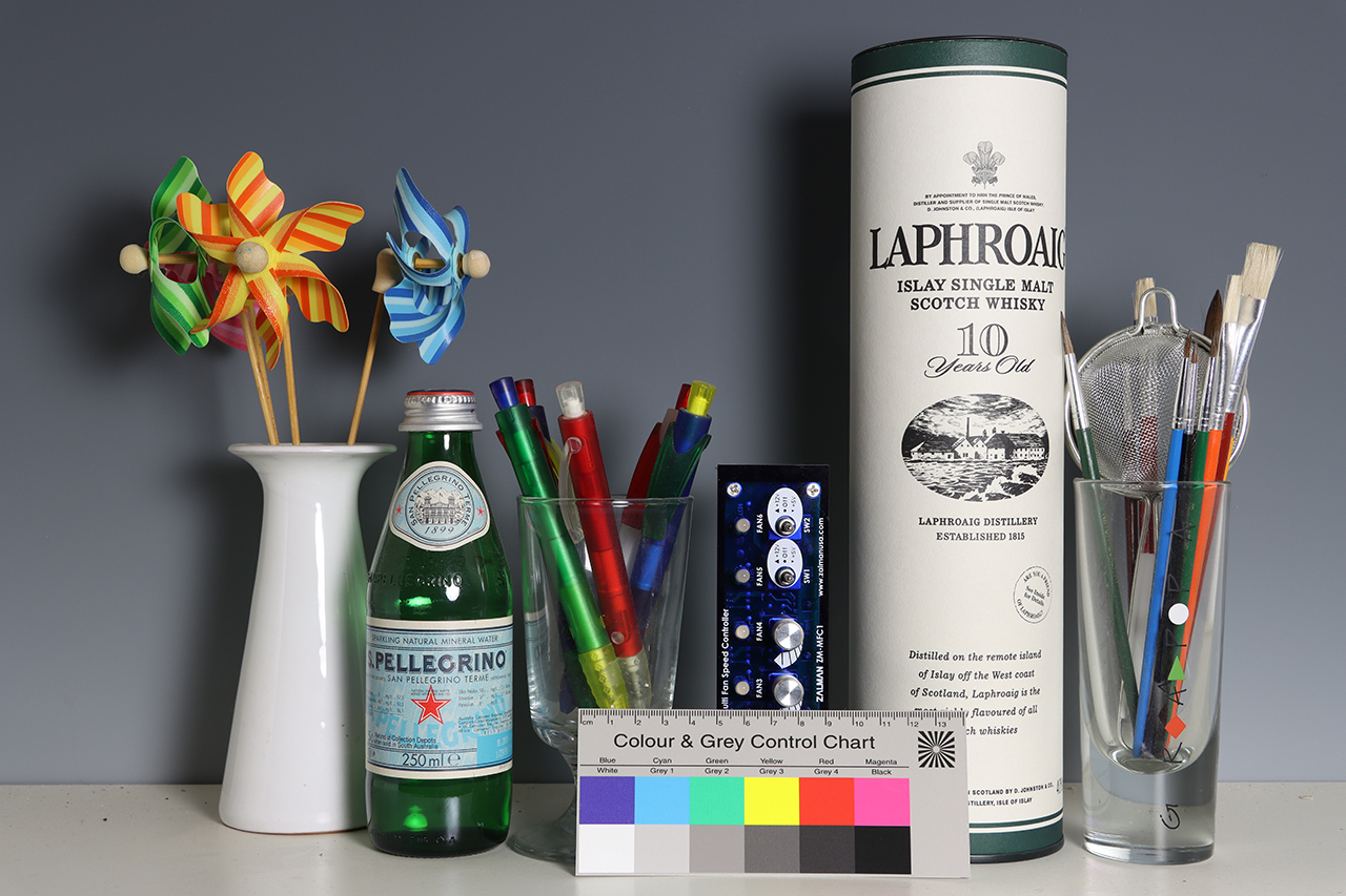Das erste Bild zeigt den Aufbau im Studio, der wie immer mit einer Tageslicht-Fotoleuchte beleuchtet wurde. Die Helligkeit entspricht etwa EV 7.