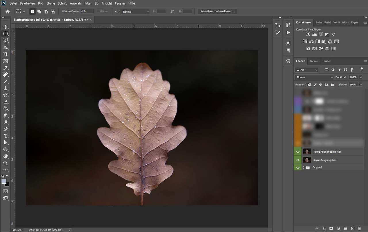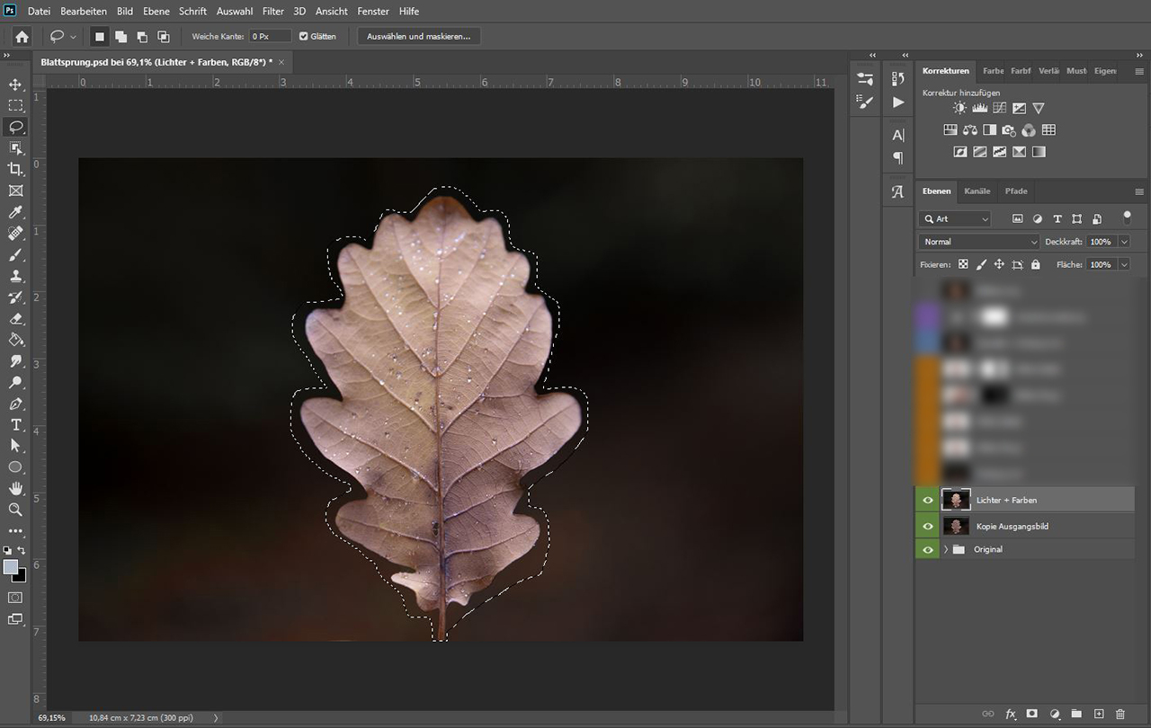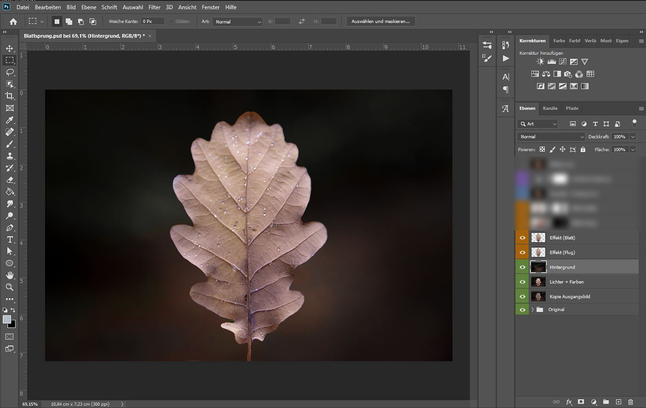 Nun haben wir das Eichenblatt auf einer eigenen Ebene. Wir benötigen aber nun auch eine Ebene, auf der es ausschließlich den Hintergrund gibt. Das bedeutet, dass wir aus der vorhin erstellten Ebene „Lichter + Farben“ einen durchgehenden Hintergrund basteln müssen.