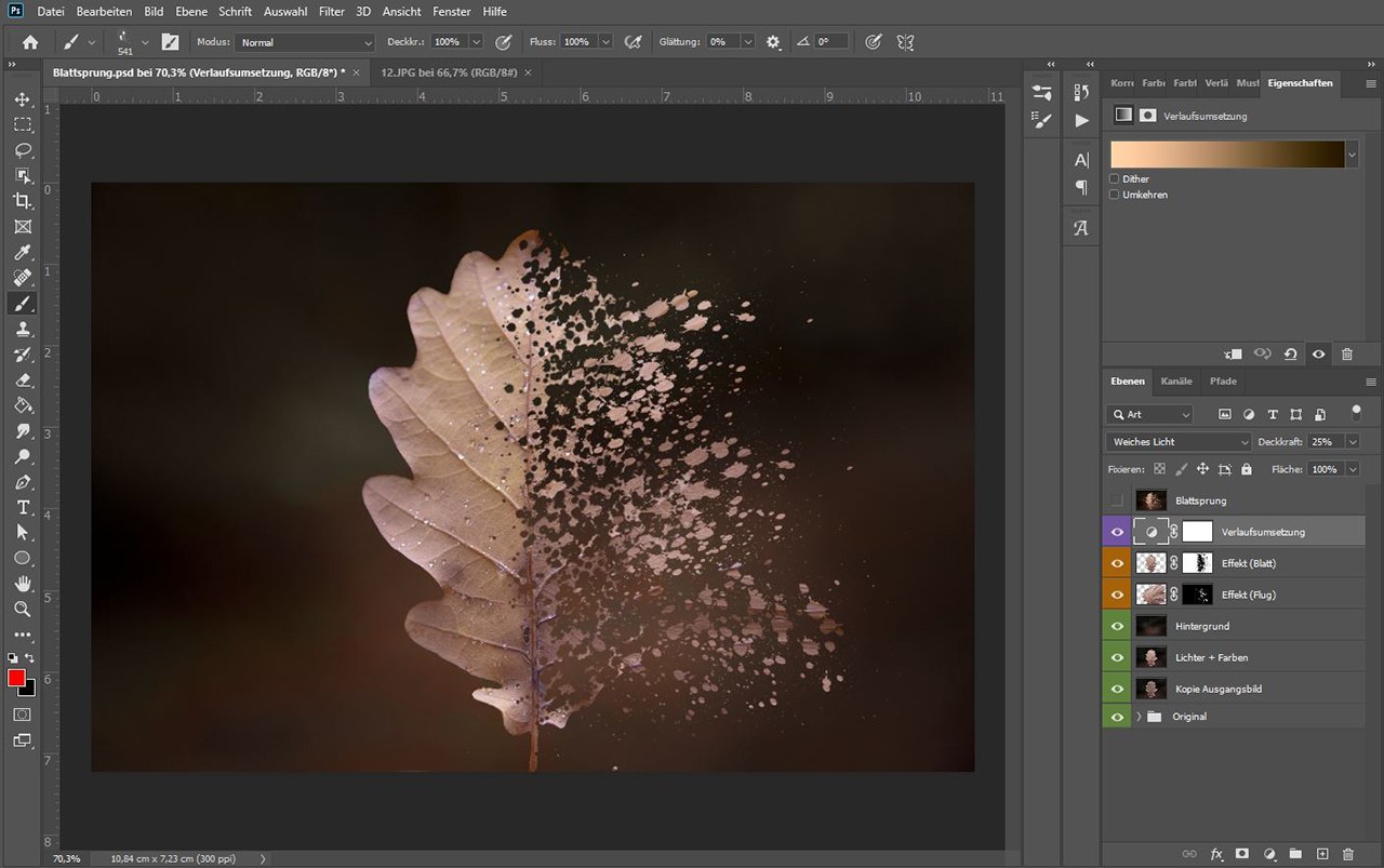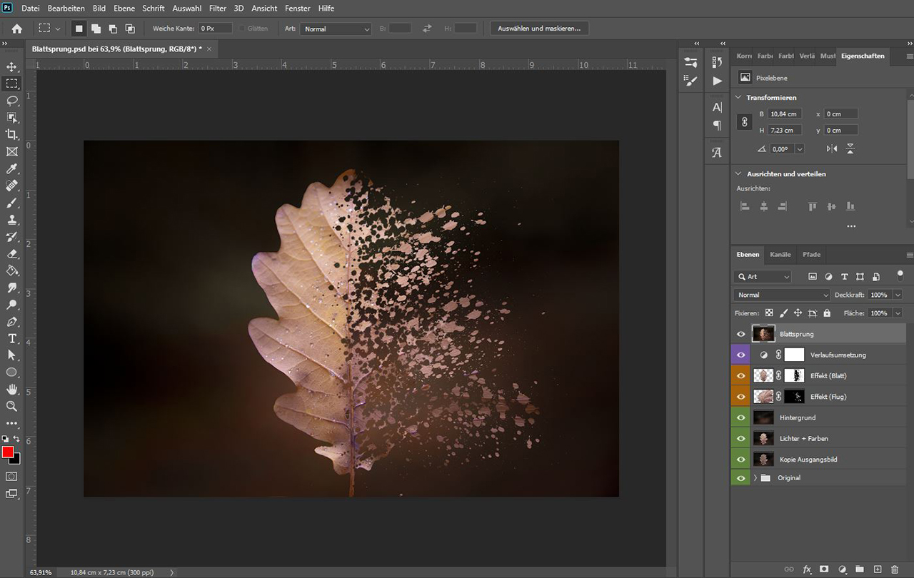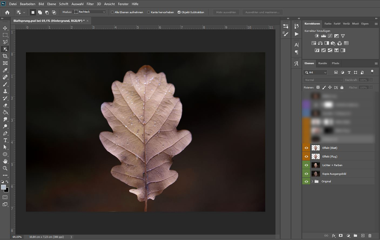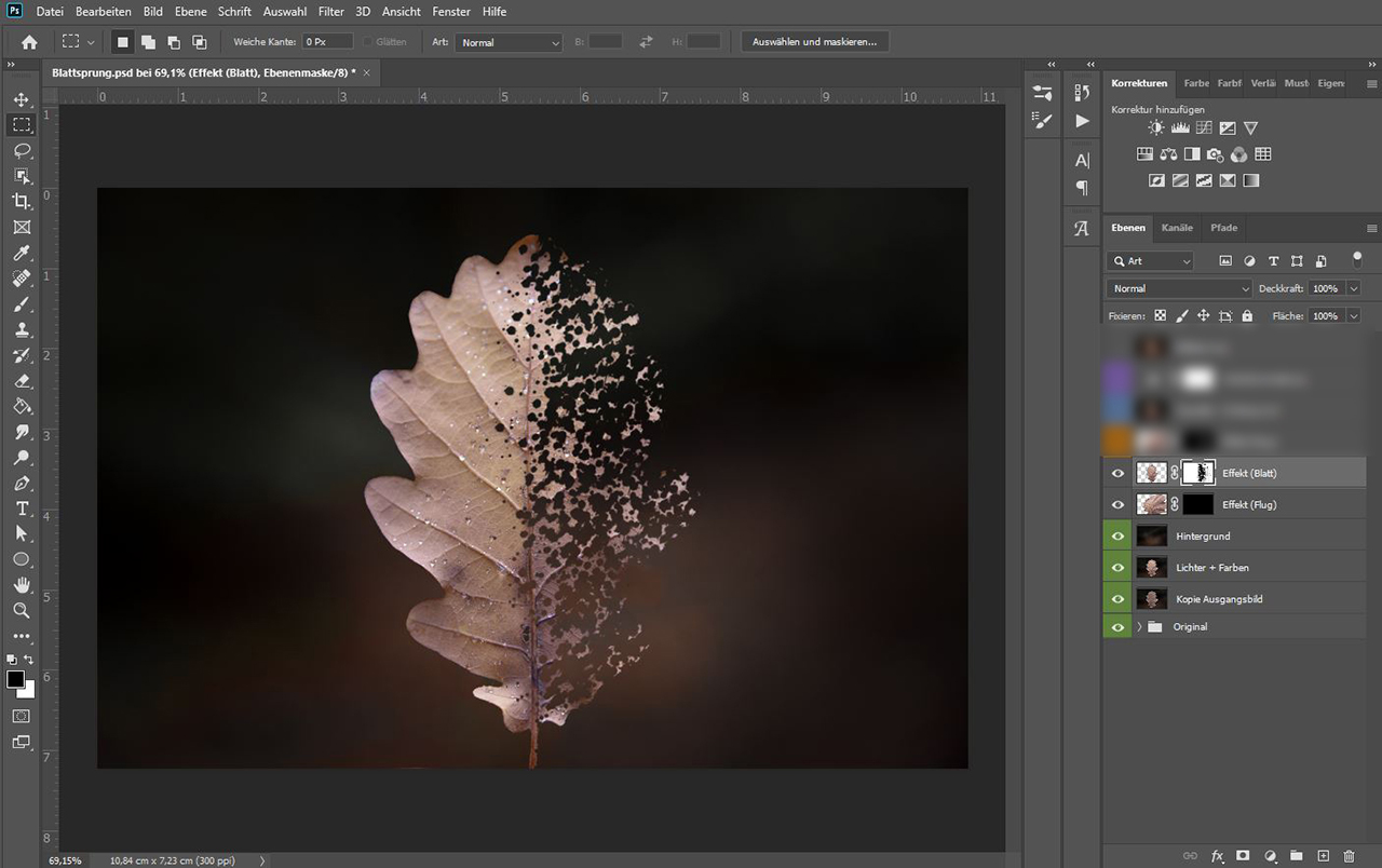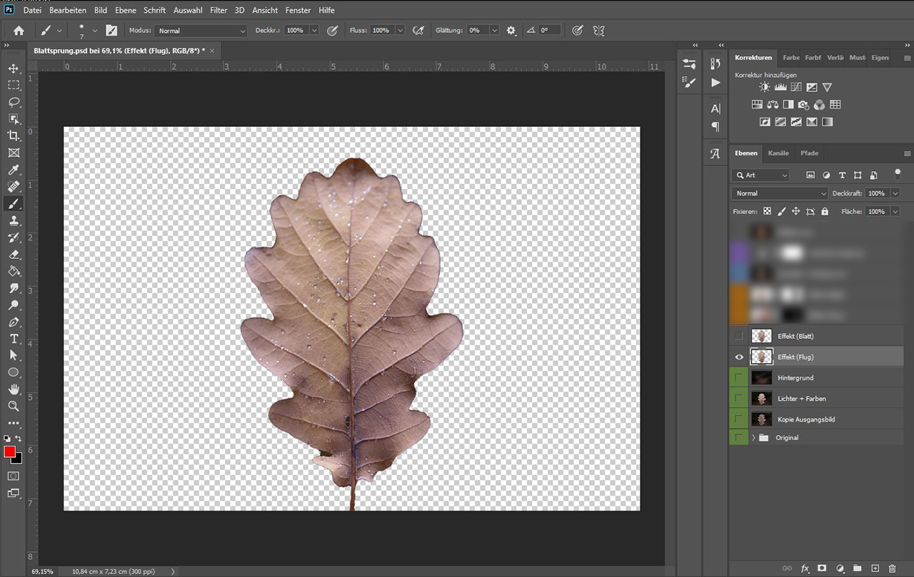 Das Eichenblatt ist nun als Kopie auf einer eigenen Ebene. Davon brauchen wir dann noch eine Kopie. In meinem Fall habe ich diese umbenannt in „Effekt (Blatt)“ und „Effekt (Flug)“.