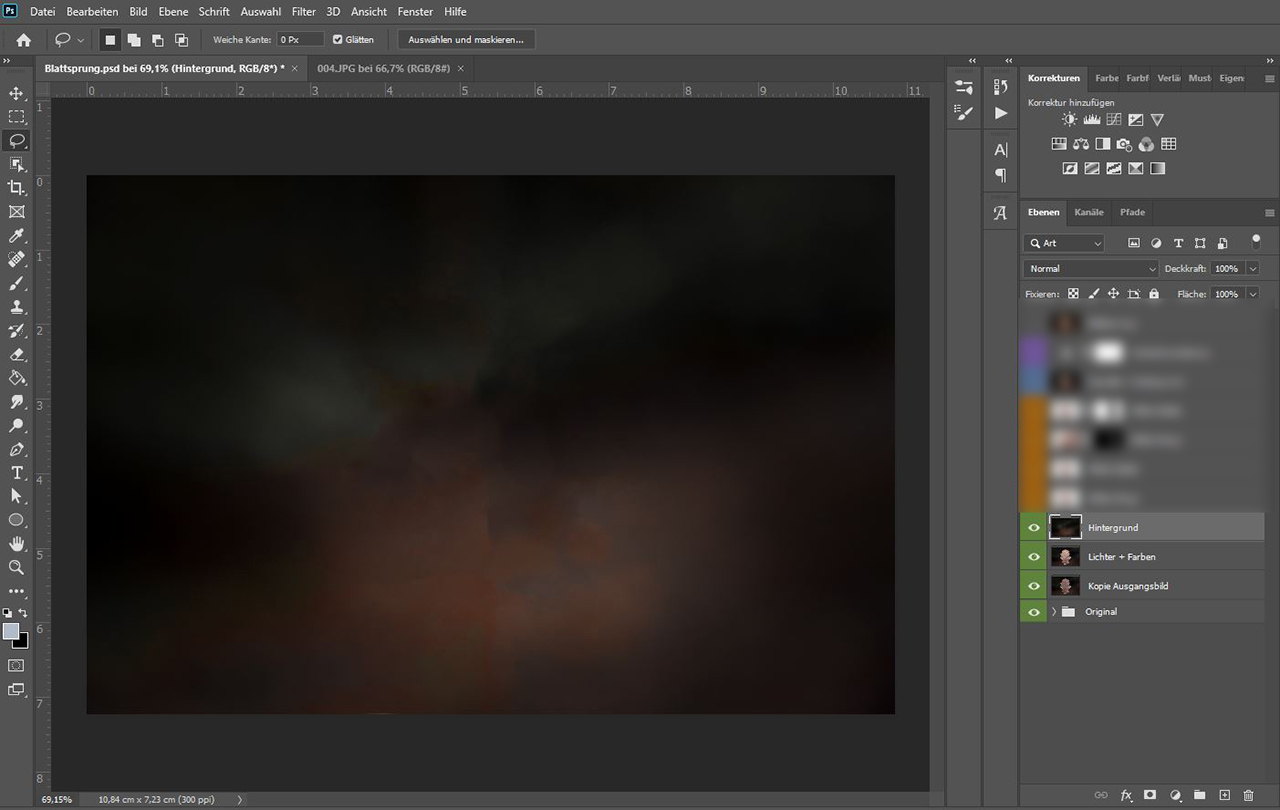 (Diesen Hintergrund habe ich in meinem Fall noch farblich angepasst. Grüntöne raus, eine leichte Vignettierung. Je nach Motiv und eigenem Geschmack…)