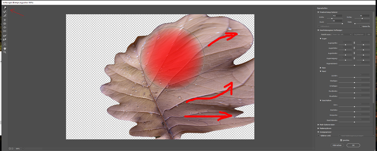 Als nächstes öffnen wir das Verflüssigen-Werkzeug („Filter > Verflüssigen…“)
