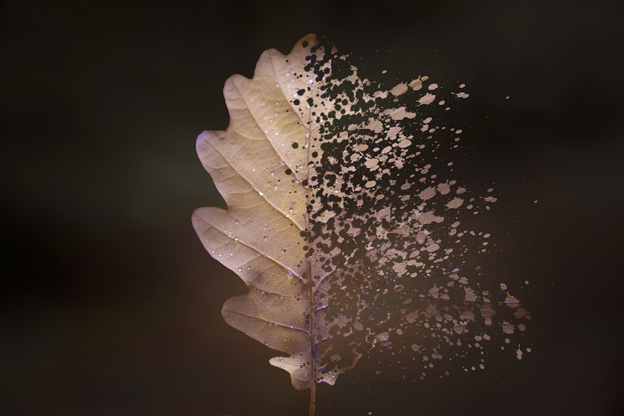 Mit dem „Mitziehen-Werkzeug“ ziehen wir mit einer großen Pinselspitze das Hauptmotiv, diesem Fall also das Blatt, nach rechts. Je weiter wir das Blatt zerren, desto weiter der spätere Partikelflug. In meinem Fall sah das am Ende so aus: