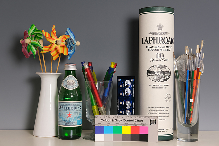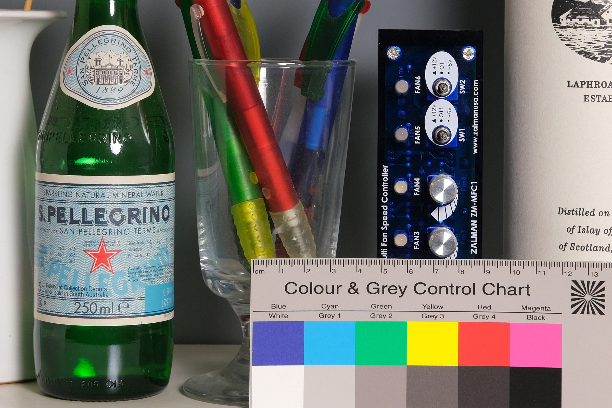 Das erste Bild zeigt den Aufbau im Studio, der wie immer mit einer Tageslicht-Fotoleuchte beleuchtet wurde. Die Helligkeit entspricht etwa EV 7.