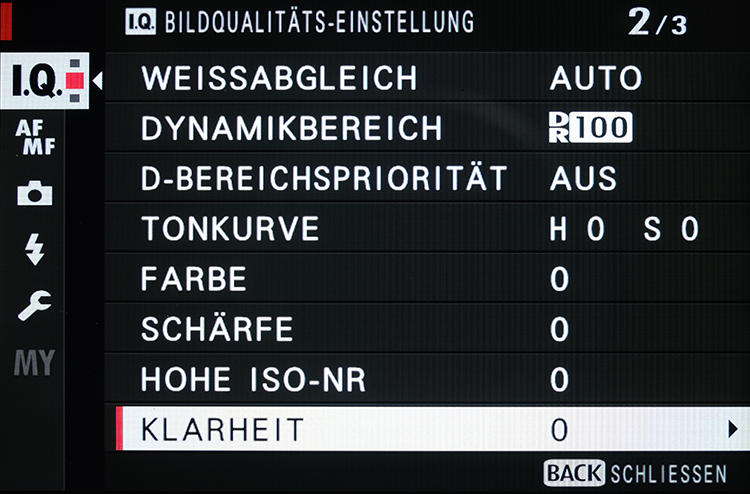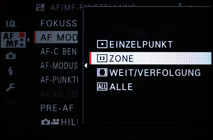 Meistens verwende ich nur ein Messfeld, aber natürlich ist man nicht darauf festgelegt. Wie aus anderen Fujifilm X-Modellen bekannt, kann man im Menü oder Quick-Menü eine größere „Zone“ wählen, dazu die Einstellung „Weit/Verfolgung“ und „Alle“.
