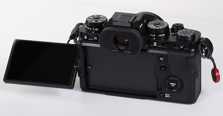 Die Rückwand wird vom 3“-Touchscreen-Monitor beherrscht, der gegenüber der X-T3 in Sachen Auflösung (1,69 Mio. RGB-Dots / 1,04 Mio.) und Beweglichkeit (2 Achsen / 1 Achse) verbessert wurde.