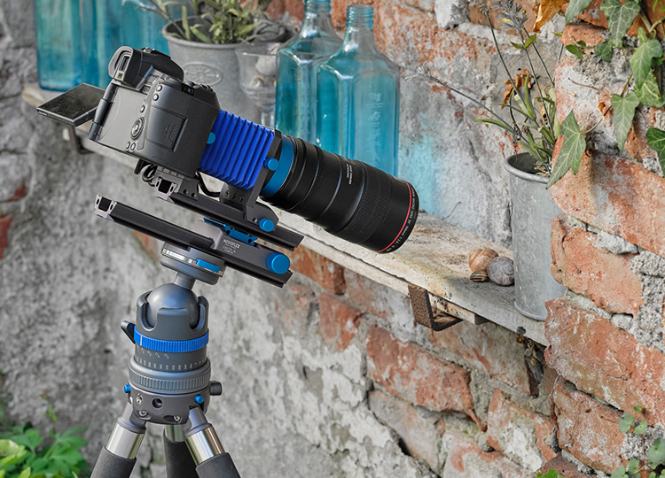 Die neue Stativbasis oder Stativschulter (die 4. im System) ist mit drei beweglichen Aufnahmen für die wechselbaren Stativbeine ausgestattet. Es stehen Beine aus Carbon und Alu in verschiedenen Längen zur Wahl – bis hin zu den Mini-Makrobeinen, mit denen sich ein stabiles Tischstativ realisieren lässt.