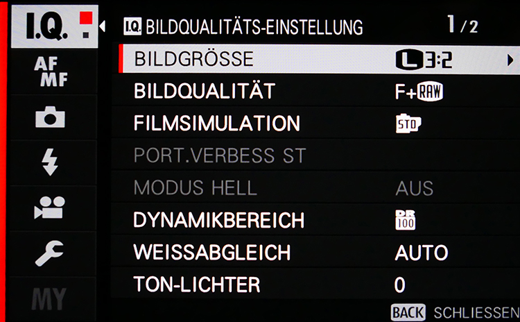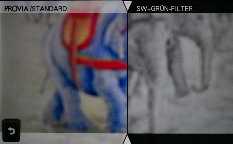 Typisch für Fujifilm sind die Filmsimulationen, die gegenüber der X-T4 oder X-Pro3 etwas eingedampft wurden. Die Standardeinstellung ist Provia. Dazu kommen Velvia (lebendig), Astia (weich), Classic Chrome, Pro Negativ (Hi, Standard), Schwarz/Weiß, SW mit Filter (Gelb, Rot, Grün) und Sepia. Auch hier kann man zwei Einstellungen auf dem Split-Screen nebeneinander betrachten.