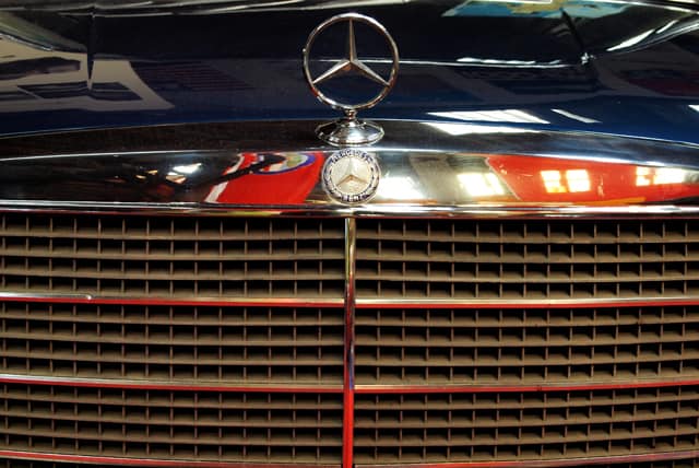 … und den Kühlergrill eines älteren Mercedes zeigen, wobei hier schon die unterschiedlichen Spiegelungen im Chrom die Symmetrie brechen.