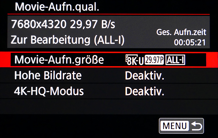 Auf meiner 64 GByte großen Karte wurde die 8K-Aufzeichnung nach rund 7 Minuten abgebrochen. Der Grund war aber nicht zu viel Wärme, sondern zu wenig Speicherplatz. Anders ausgedrückt: Die Karte war voll. Sie wurde sofort neu formatiert, nahm wieder 7 Minuten auf und der Vorgang wiederholte sich. Im 3. Durchgang leuchtete dann nach rund 3 Minuten das Warnsignal für zu große Wärme auf und gute 2 Minuten später wurde die Aufzeichnung abgebrochen … dieses Mal eben wegen der Wärmeentwicklung.