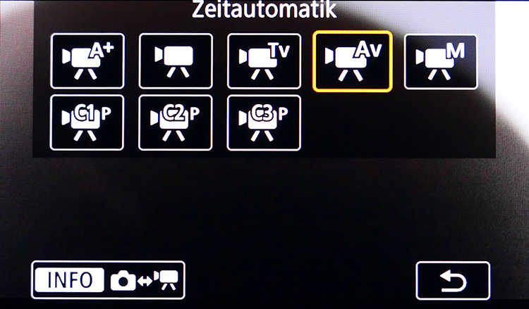 Zurück zur Videokamera in der EOS R5. Man aktiviert sie, indem man zunächst die MODE- und dann die INFO-Taste drückt. Jetzt kann man die Video-Betriebsart (Automatische Motiverkennung, Programm-, Zeit- und Blendenautomatik, Manuell-Modus oder eine von drei selbst konfigurierten Einstellungen) wählen.