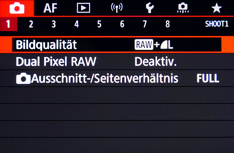 Für nachträgliche geringe Korrekturen der Schärfenebene kann man das aus der 5D Mark IV bekannte Dual Pixel RAW verwenden – dann muss man aber vorher wissen, dass man nach der Aufnahme wohl noch korrigieren muss, denn die Funktion muss eigens aktiviert werden.