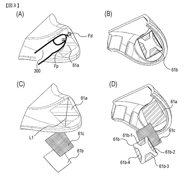 Das Patent beschreibt ein Touch-Pad, das oben auf dem Handgriff untergebracht ist (der entsprechend dimensioniert sein muss). Im Bild: Nummer 61.