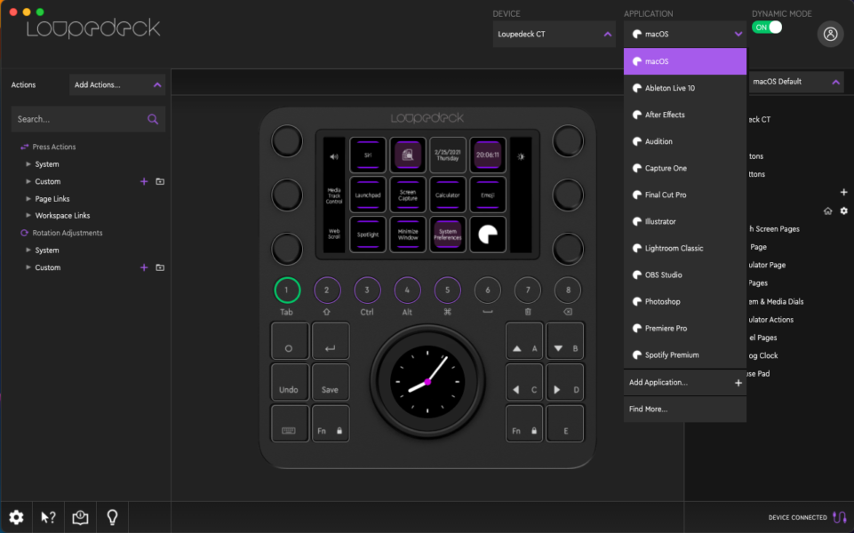 Über die zentrale Abbildung des Loupdeck CT kann die Belegung der Tasten eingesehen und angepasst werden. Das geschieht mittels Drag&Drop. Die entsprechenden Aktionen können je nach Programm aus einer Liste ausgewählt und auf die gewünschte Taste gezogen werden. So ist es schnell möglich, die verschiedenen Presets nach den eigenen Wünschen zu verfeinern. In Kombination mit den verschiedenen Workspaces ergeben sich so enorme Möglichkeiten der eigenen Kreativität freien lauf zu lassen.