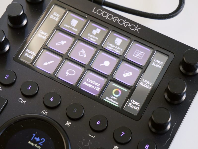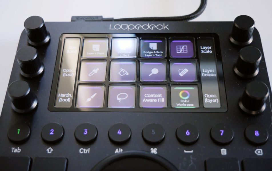 Das zentrale Element des Loupedeck CT ist der große Block aus OLED-Tasten, die flexibel über die Software angepasst werden können. Je nach Software und eigenem Gusto können sie mit verschiedenen Funktionen belegt werden. Zudem ist es möglich, verschiedene Sets – „Workspaces“ genannt – zu hinterlegen, die über die Tasten 1-8 in der Reihe unter dem Display aufgerufen werden können. Für das Composing oder die Retusche kann so das Handling angepasst werden. Die Betätigung einer Display-Taste wird mit einem sehr lauten Vibrieren quittiert.