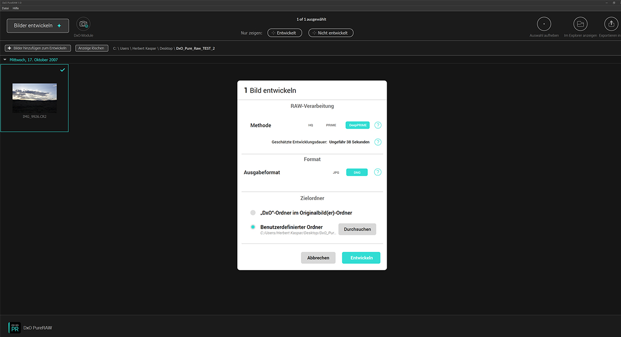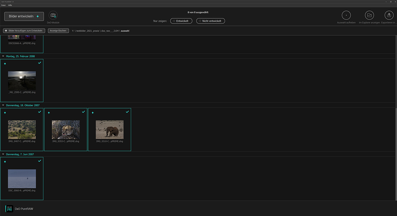 Die Bedienung ist selbsterklärend aber auch rudimentär: Beim Hinzufügen der Bilder wird auf fehlende DxO-Optikmodule hingewiesen, die dann (zwingend) herunterzuladen und abzuspeichern sind. Beim Entwickeln kann man drei Dinge entscheiden – mehr aber auch nicht: die Methode (HG – Prime – DeepPrime), das Ausgabeformat (JPG – DNG) und den Zielordner. Entscheidet man sich für DNG – aber nur das macht Sinn – braucht man Speicherplatz, viel Speicherplatz: Soweit mir verfügbar, wurden aus einer alten (2004) NEF-Datei mit 6 MB als ‚DxO-DNG‘ locker mal 22 MB, aus einer aktuellen (2020) NEF-Datei mit 47 MB wurden 63 MB, aus einer ORF-Datei (2018) mit 18 MB wurden 58 MB und aus einer Leica-DNG-Datei (2019) mit 45 MB wurden 77 MB.