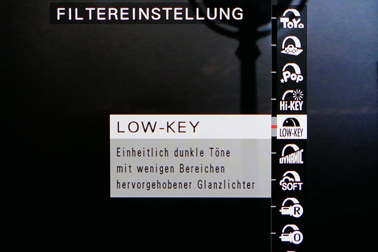 Mit der Einstellung FILTER kann man, natürlich, zwischen Filtern wählen. Es sind acht, wenn man die Möglichkeit, Color Key Effekte auf verschiedene Farben anzuwenden, als einen Filter zählt. High Key, Low Key und Soft verwende ich für mich immer wieder mal, die anderen, wie Toy der Pop-Farbe eher nicht – aber das ist Geschmackssache.