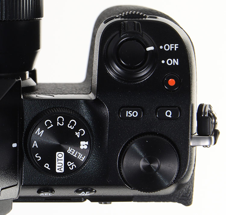 Auf dem Handgriff sitzt die Kombi, die ich immer wieder lobe: Der Hauptschalter umgibt den Auslöser und man ist mit einem Griff aufnahmebereit. Der Knubbel mit dem man den Hauptschalter bewegt könnte ausgeprägter sein. Gleich daneben: der Movieauslöser. Das kann, bis man sich eingewöhnt hat, zu ungewollten Filmchen führen, zumal dahinter die Q-Taste liegt, mit der man das übersichtliche Quick-Menü aufruft, um 12 wichtige Funktionen schnell zu erreichen. Rechts davon die ISO-Taste.