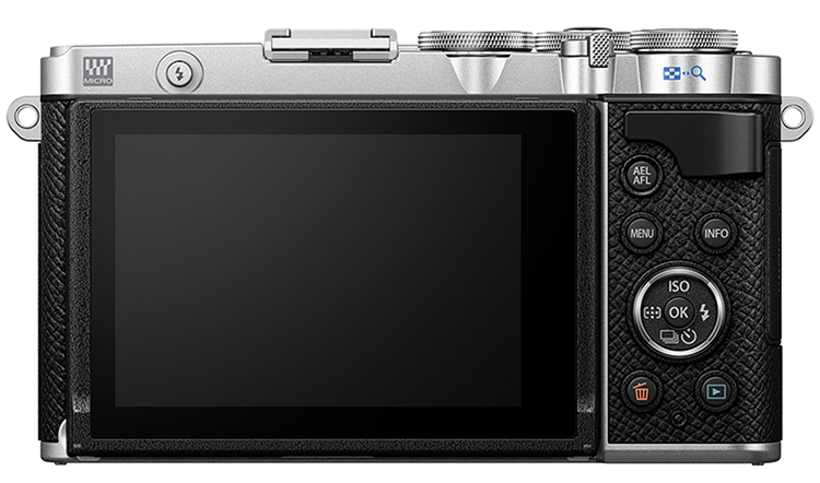 Trotz des kleinen Gehäuses machen physische Einstellelemente den Umgang mit der Kamera einfach und intuitiv. Dazu gehören drei aus Aluminium gefräste Einstellräder auf der Deckplatte (darunter das Betriebsartenwählrad) und ein Umschalter auf der Frontseite, mit dem man zwischen dem Standard-Fotomodus und der Profilsteuerung für Farbe und S/W wechseln kann.