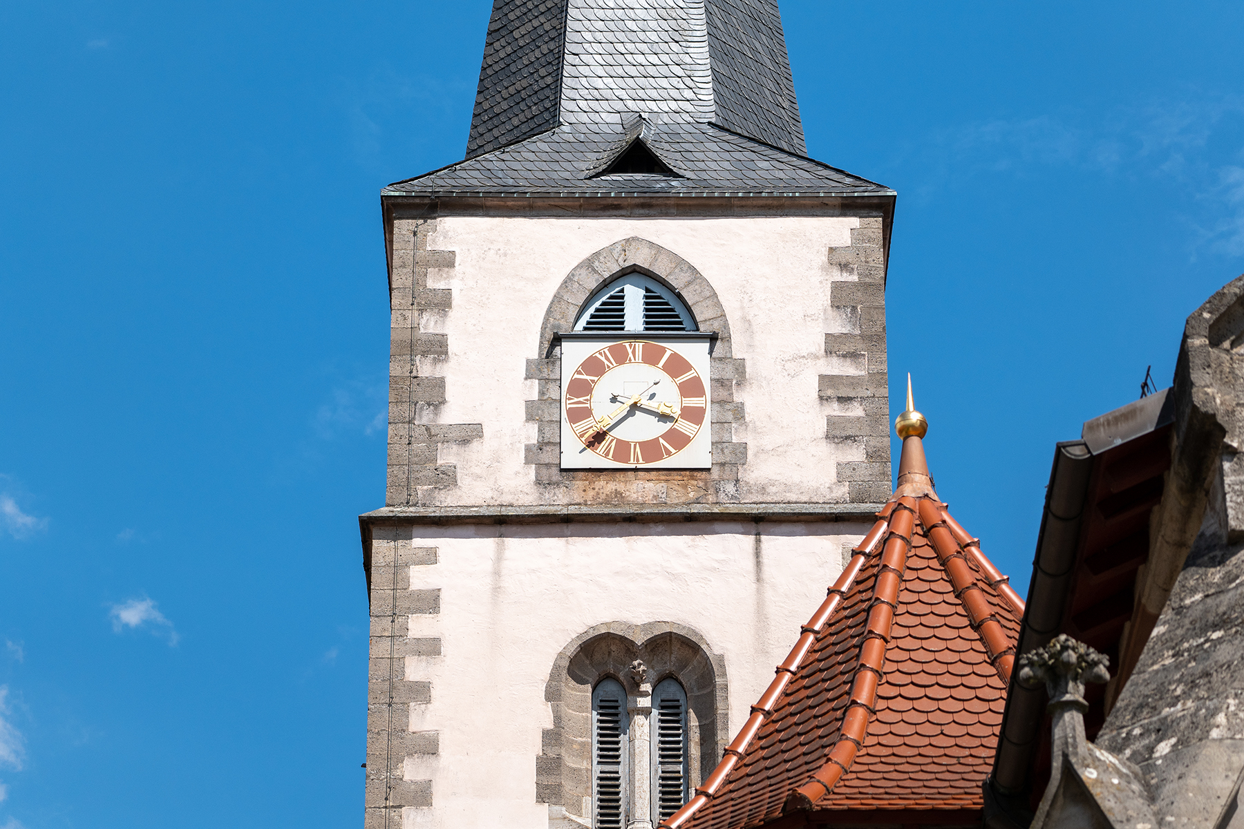 Gerade für de Praxistest langbrennweitiger Objektive ein Teil meiner Hammelburger Runde: Der Turm der Stadtpfarrkirche St. Johannes der Täufer.