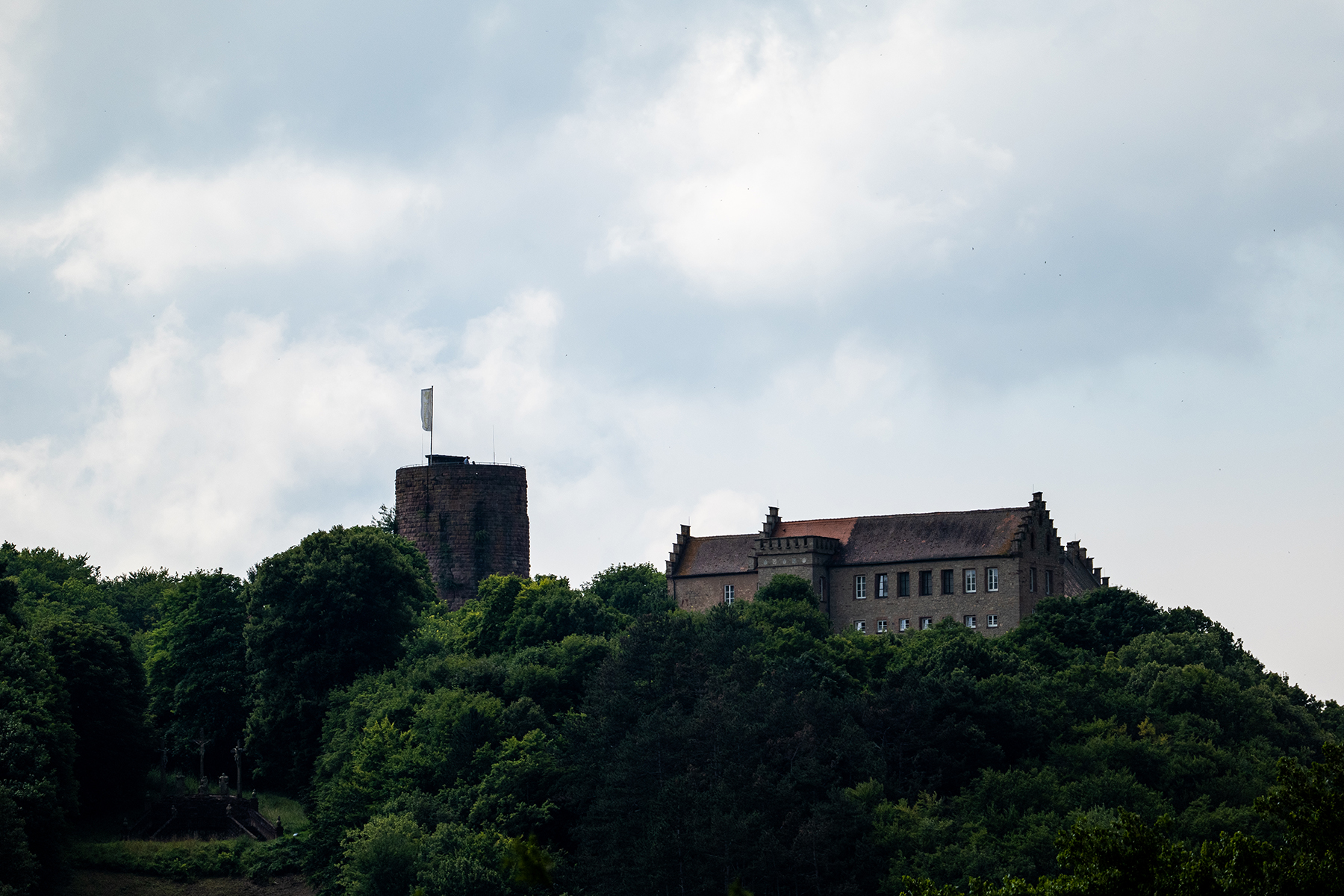Ein weiterer Eckpunkt der Hammelburger Runde: Schloss Saaleck jenseits des Tals der fränkischen Saale in rund 1,4 km Entfernung.