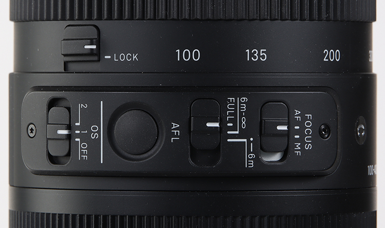 Vorne am Tubus ist der breite Zoomring angeordnet. Er kann mit der LOCK-Taste in der 100-mm-Position verriegelt werden, um zu verhindern, dass das Zoom beim Tragen ungewollt länger wird. Die klassischen Telebrennweiten 100 – 135 – 200 – 300 – 400 (mm) sind auf den Ring aufgetragen, der um etwas mehr als eine Viertel Umdrehung gedreht werden muss, um den Bereich zu durchfahren. Die Wahl der passenden Brennweite geht gut und sicher – etwas (!) weniger Widerstand beim Drehen wäre aber angenehm.