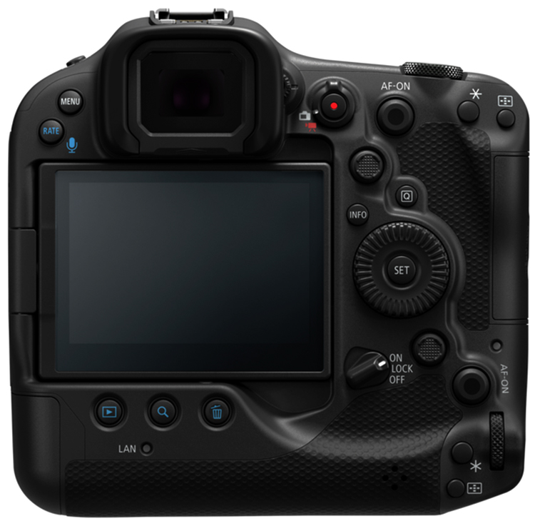 Unter dem abgerundeten Sucherbuckel sitzt natürlich ein EVF – Daten dazu gibt es noch nicht. Der Suchermonitor der R5 hat eine Auflösung von 2,36 Mio. RGB-Dots und eine Vergrößerung von 0,62x. Das ist bei der EOS R3 hoffentlich besser – die Sony A1 gibt hier 9,44 Mio. RGB-Dots und 0,9x vor!