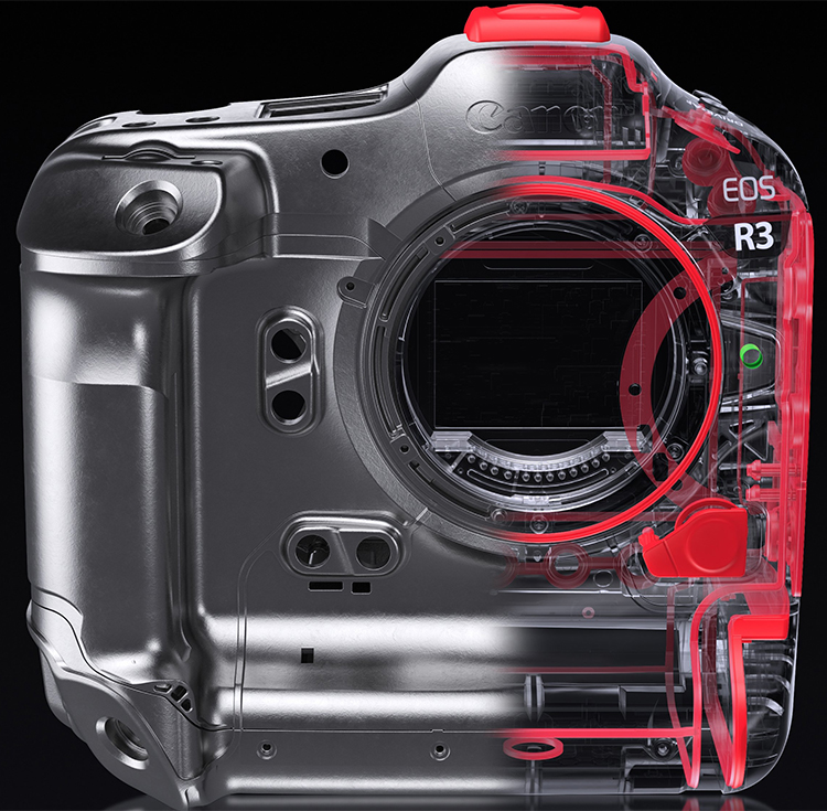 Die Canon EOS R3 ist wie die DSLRs der EOS-1D-Serie eine bullige Kamera. Das Gehäuse aus einer Magnesiumlegierung ist auf den harten Profi-Einsatz abgestimmt und der Schutz gegen Staub- und Spritzwasser ist auf dem Level einer EOS-1D X Mark III.