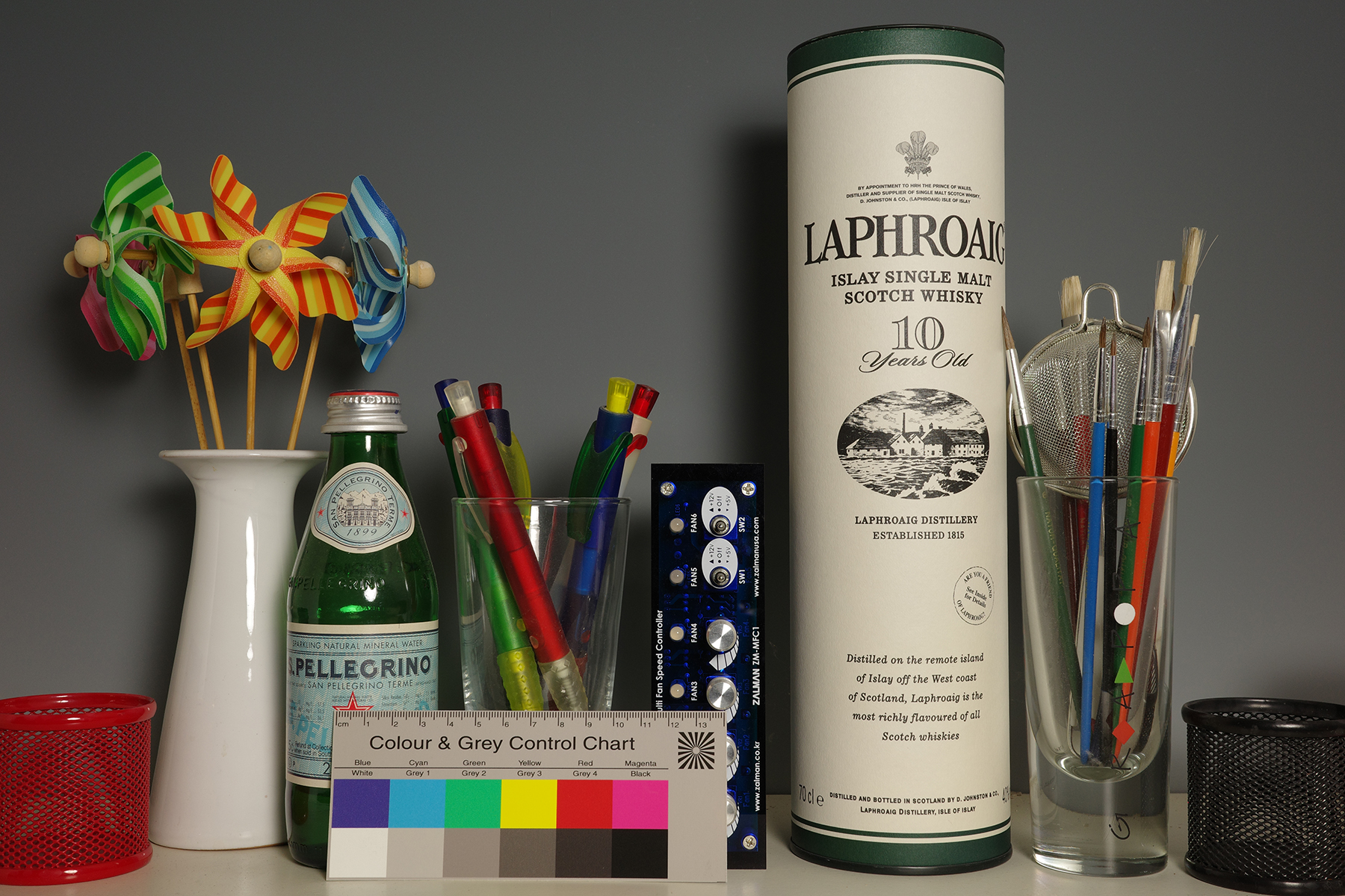 Das erste Bild zeigt den Aufbau im Studio, der wie immer mit einer Tageslicht-Fotoleuchte beleuchtet wurde. Die Helligkeit entspricht etwa EV 7.