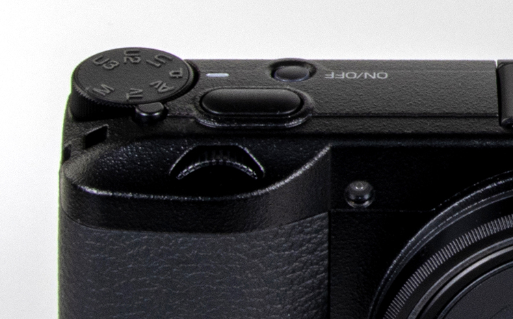 Die Oberseite ist nur rechts mit Einstellelementen besetzt. Das sind der Hauptschalter, der von einem grünen Ring umgeben ist, wenn die Kamera eingeschaltet ist, der länglich schmale Auslöser, der in dieser Form gut zum schmalen Gehäuse passt, und in der hinteren rechten Ecke das Betriebsartenwählrad mit der zugehörigen Entriegelungstaste.