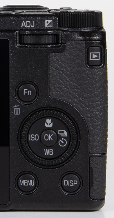 Das zweite Einstellrad umgibt die 4-Richtungswippe, mit der man den Makro-Modus (oben), die Bildfolge-Einstellungen (rechts), die Weißabgleich-Einstellungen (unten) und die Wahl der Empfindlichkeiten (links) aufrufen kann. Statt der Bildfolge- und ISO-Einstellungen kann man auch andere Funktionen auf die beiden entsprechenden Positionen legen.