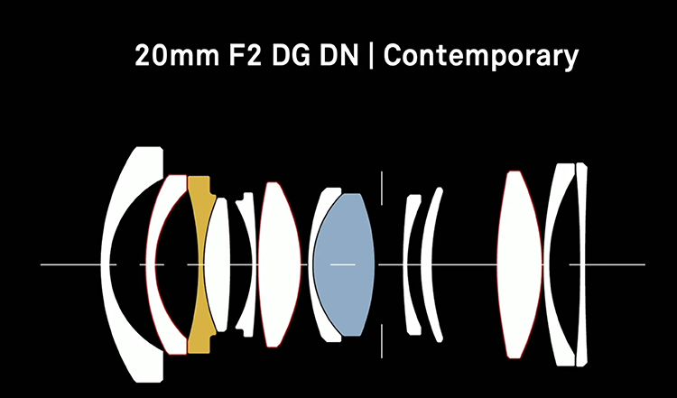 Das Innenleben wurde von Grund auf neu entwickelt und umfasst 13 Elemente in 11 Gruppen, mit einer FLD-, einer SLD- und drei asphärischen Linsen. Sie sollen sicherstellten, dass das 20-mm-Objektiv schon bei ganz offener Blende eine hohe Abbildungsleistung von der Mitte bis zum Rand bietet.