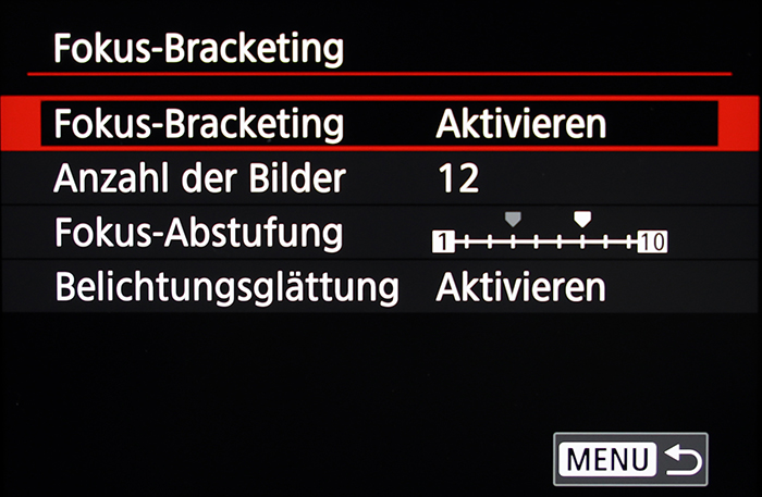 Man gibt zunächst vor, wie viele Aufnahmen gemacht werden sollen. Bis 999 Aufnahmen sind möglich – was ein bisschen viel ist, aber man weiß ja nie. Zwischen den Einzelbildern wird die Schärfenebene ein Stückchen verschoben. Wie groß die Schritte sind, wird auf einer Skala ohne Benennung festgelegt.