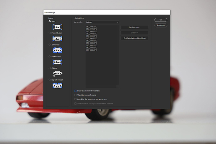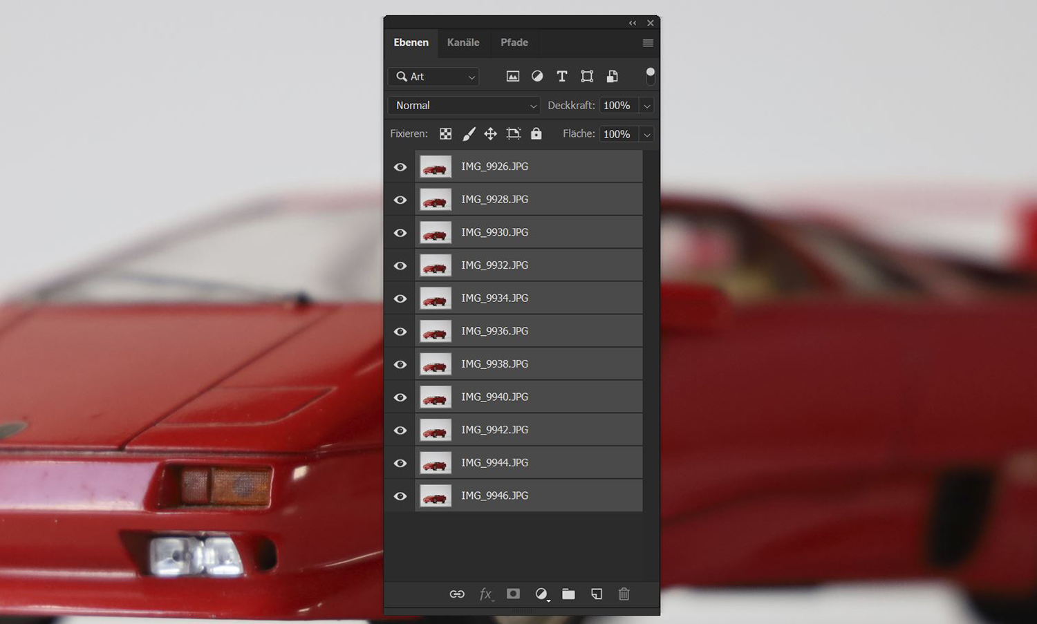 Photoshop führt nun die Einzelbilder als Ebenen in ein Bild zusammen. Dabei werden sie automatisch ausgerichtet. Das klappt sehr gut. Zwar können zu große Unterschiede in der Lage des Objekts im Bildfeld nicht ausgeglichen werden, aber da man mit einem stabilen Stativ gearbeitet, ist das nicht so wichtig.