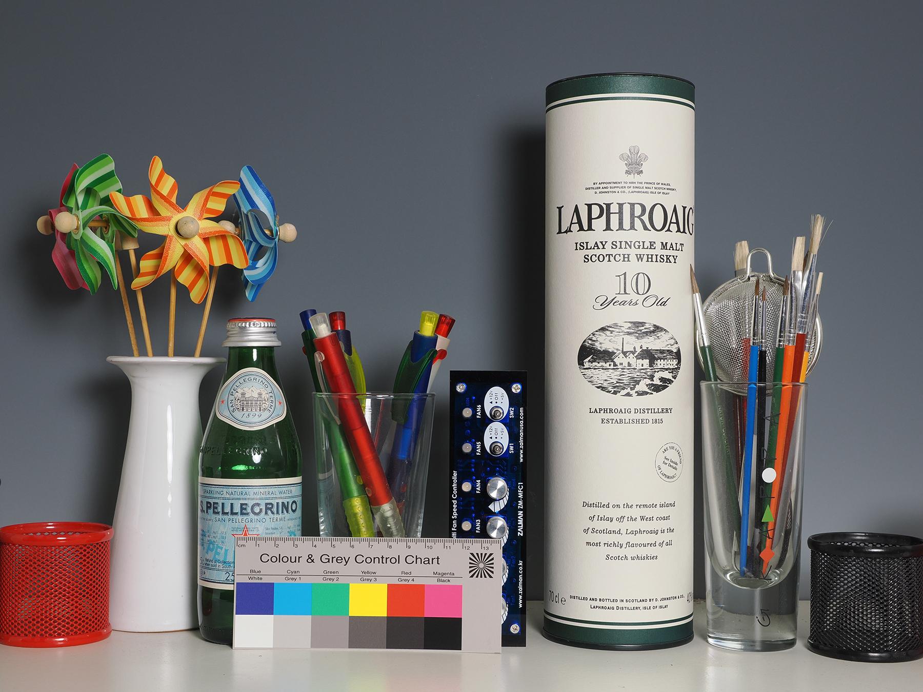 Das erste Bild zeigt den Aufbau im Studio, der wie immer mit einer Tageslicht-Fotoleuchte beleuchtet wurde. Die Helligkeit entspricht etwa EV 7.