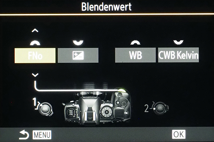 Ich entscheide mich für Modus 1: Zwischen zwei Belegungen der Einstellräder wechseln. Danach lege ich auf Ebene 1, dass ich mit dem vorderen Einstellrad je nach Modus Blende oder Verschlusszeit bestimme, mit dem hinteren immer den Belichtungskorrekturfaktor. Auf Ebene 2 sind es Weißabgleich vorn und Kelvin-Wert hinten.