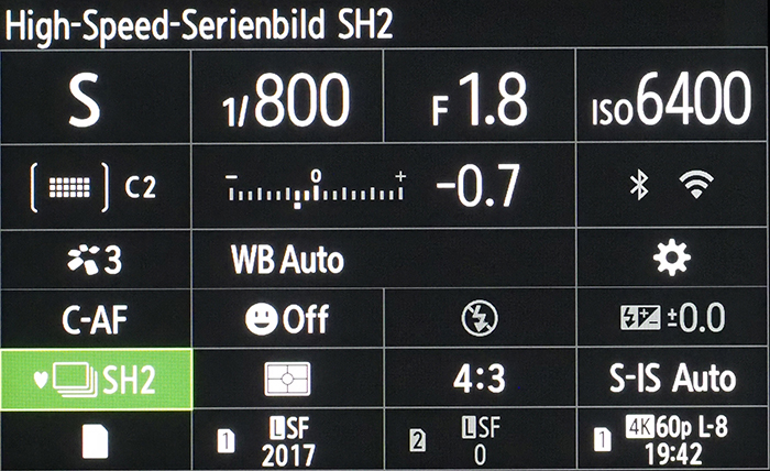 Mit der vollen 20-MPix-Auflösung sind mit ständigem Nachführen von Schärfe und Belichtung sind laut technischen Daten Serien mit bis zu 50 B/Sek. möglich, wobei das Motiv im Sucher permanent sichtbar ist – Dunkelphasen spielen keine Rolle. Voraussetzung dafür ist, dass man den elektronischen Verschluss nutzt.