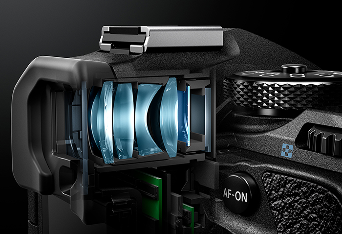 Unter dem Sucherdach ist ein elektronischer OLED-Sucher untergebracht. Er hat eine Auflösung von 1600 x 1200 Pixeln x 3 Dots/Pixel, also 5,76 Mio. RGB-Dots – sie ist damit gut 2,5x so hoch wie bei der OM-D E-M1 Mark III.