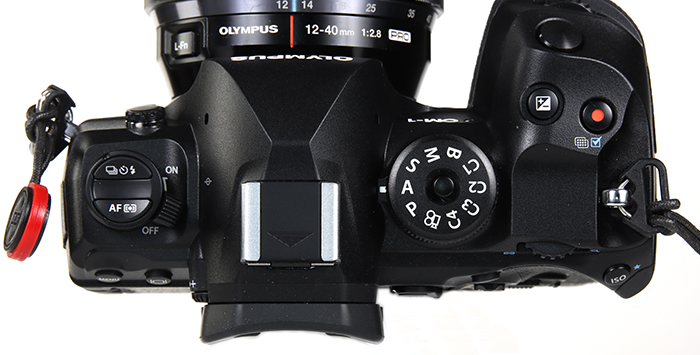 Auch bei der OM-1 liegt der Hauptschalter (wie beim 1972er Modell und den OM-D E-M1 Modellen) auf der linken Schulter, und die beiden halbrunden Knöpfe erinnern an die Rückspulkurbel der Ur-OM. Mit ihnen kann man die Bildfolge- / Blitzfunktionen bzw. AF- / Belichtungsmessmodi aufrufen und dann mit dem vorderen bzw. hinteren Einstellrad die entsprechenden Einstellungen vornehmen.