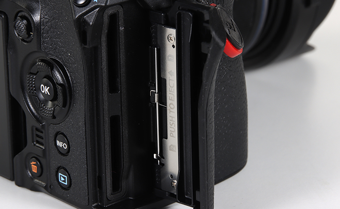 Die weiteren Einstellknöpfe (inkl. der beiden zwischen Griff und Bajonett), der Knubbel-Joystick und die 4-Richtungswippe sind gleichgeblieben, ebenso die beiden Slots für SD-Karten (bis SDXC, UHS II) und die Buchse für den Selbstauslöser auf der rechten Schmalseite.