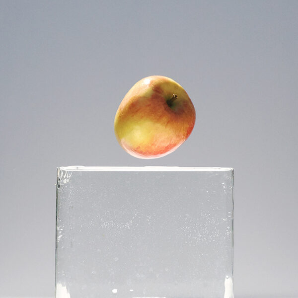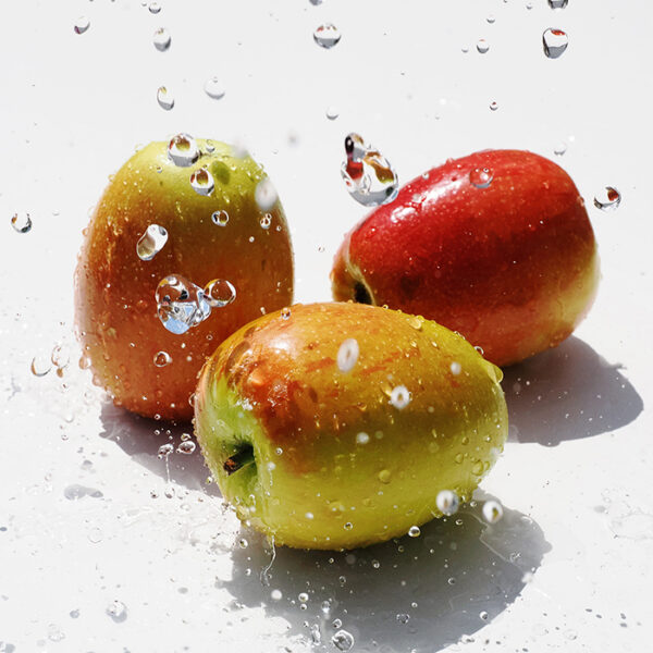 Weil der Aufbau eh nass ist, kommt noch ein Durchschlag aus der Küche zum Einsatz, der dafür sorgt, dass aus heiterem Himmel große Tropfen auf drei Äpfel fallen, ebenfalls aufgenommen mit 120 B/Sek.