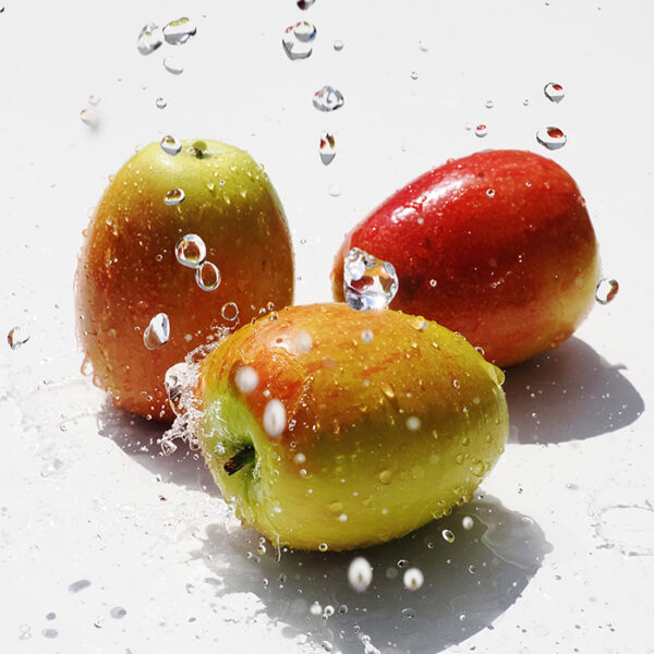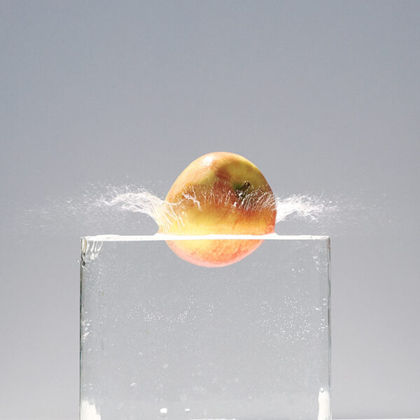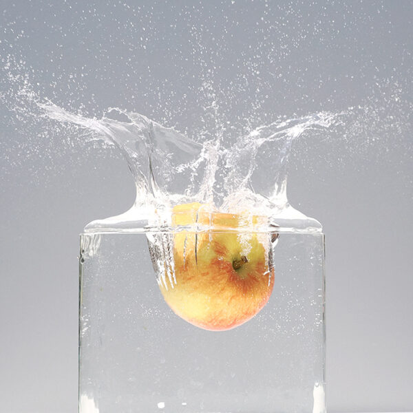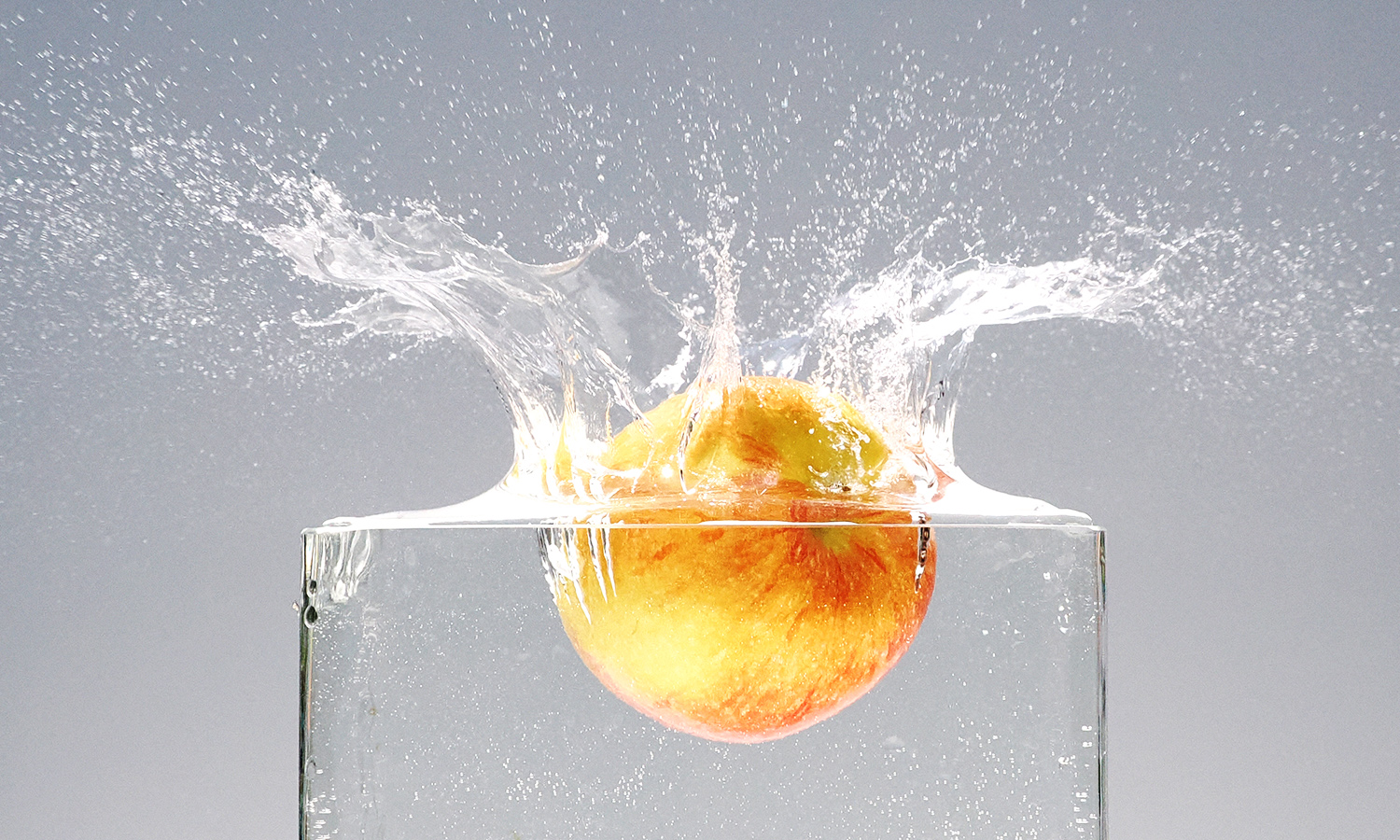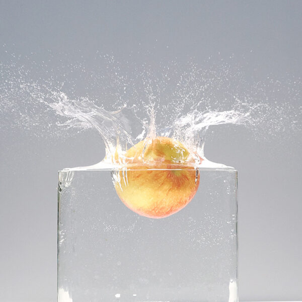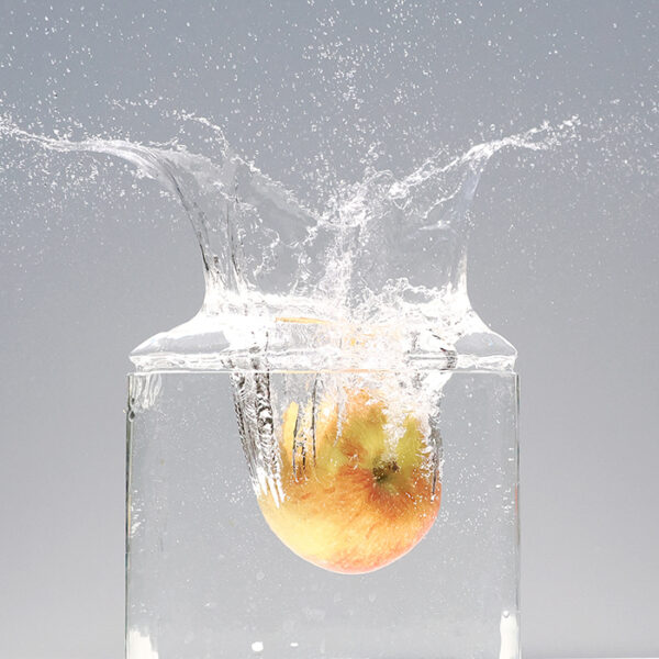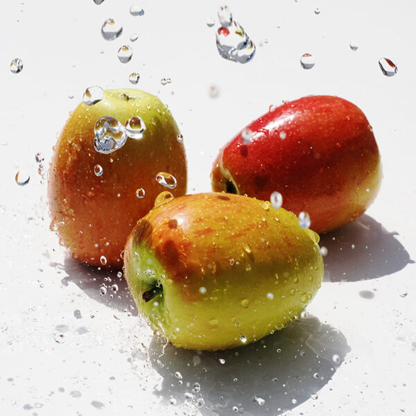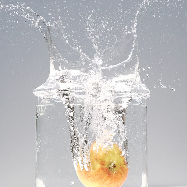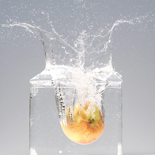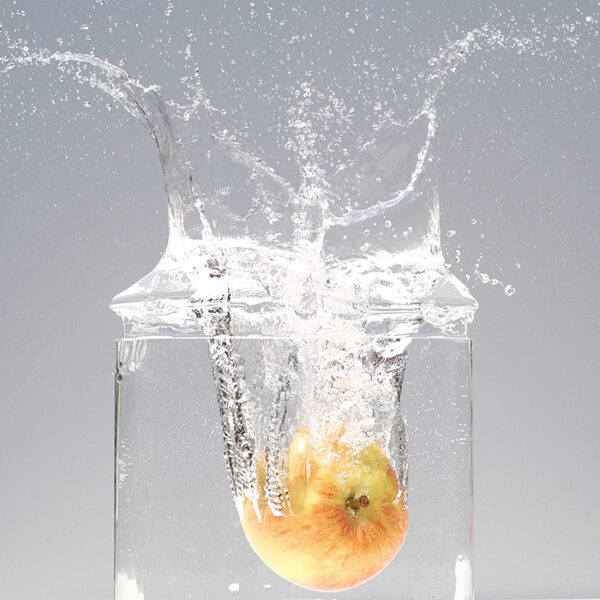Um den fallenden Apfel und die Wassertropfen scharf ins Bild kommen, wird die 1/10.000 Sek. als Verschlusszeit gewählt. Da es nicht nur warm, sondern auch hell ist, passen zur kurzen Zeit Blende 7,1 und ISO 2500.