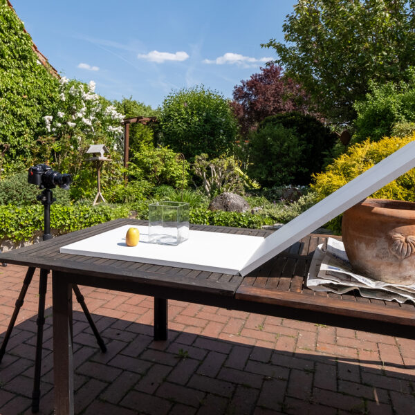Der Aufbau wird auf dem Gartentisch improvisiert. Eine nicht gebrauchte Ikea-Schranktür liegt flach auf dem Tisch, eine zweite wird schräg dahinter gestellt. Damit sie nicht wegrutscht, wird ein (noch!) leerer alter Terrakotta-Kübel zweckentfremdet.