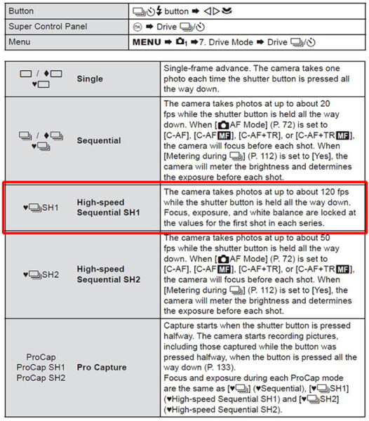 Die neue OM-1 bietet einige Möglichkeiten für Bildserien. Für die aktuelle Aufgabenstellung passt die Einstellung [Herzchen][Bildfolge]SH1.