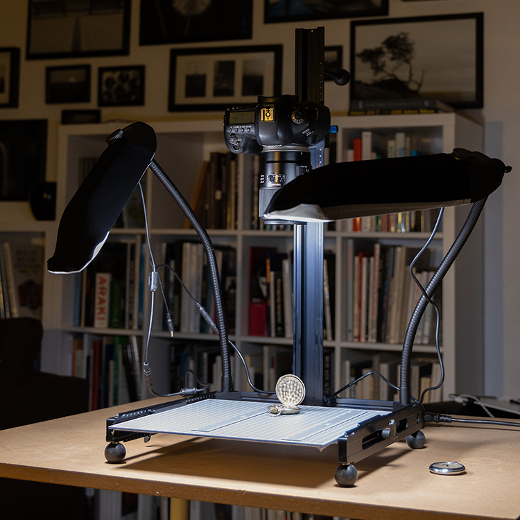 Fehlt noch Licht. Dieses Mal möchte ich die beiden LED-Leuchten einsetzen. Die RB 5020 DS2 von Kaiser Fototechnik lassen sich dimmen und dadurch kann man die Helligkeitsverteilung auf dem Objekt gut steuern.