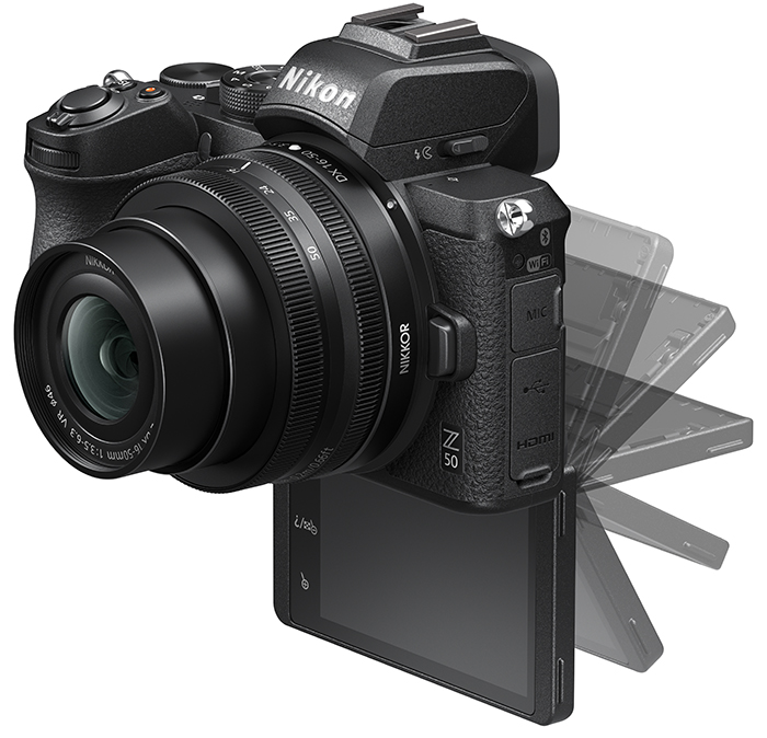 Der Monitor der Z 50 lässt sich nur nach oben und unten schwenken – das aber so weit, dass man das Bild von vorne sehen kann, was für Vlogger essenziell ist.