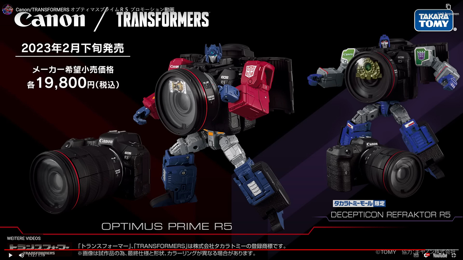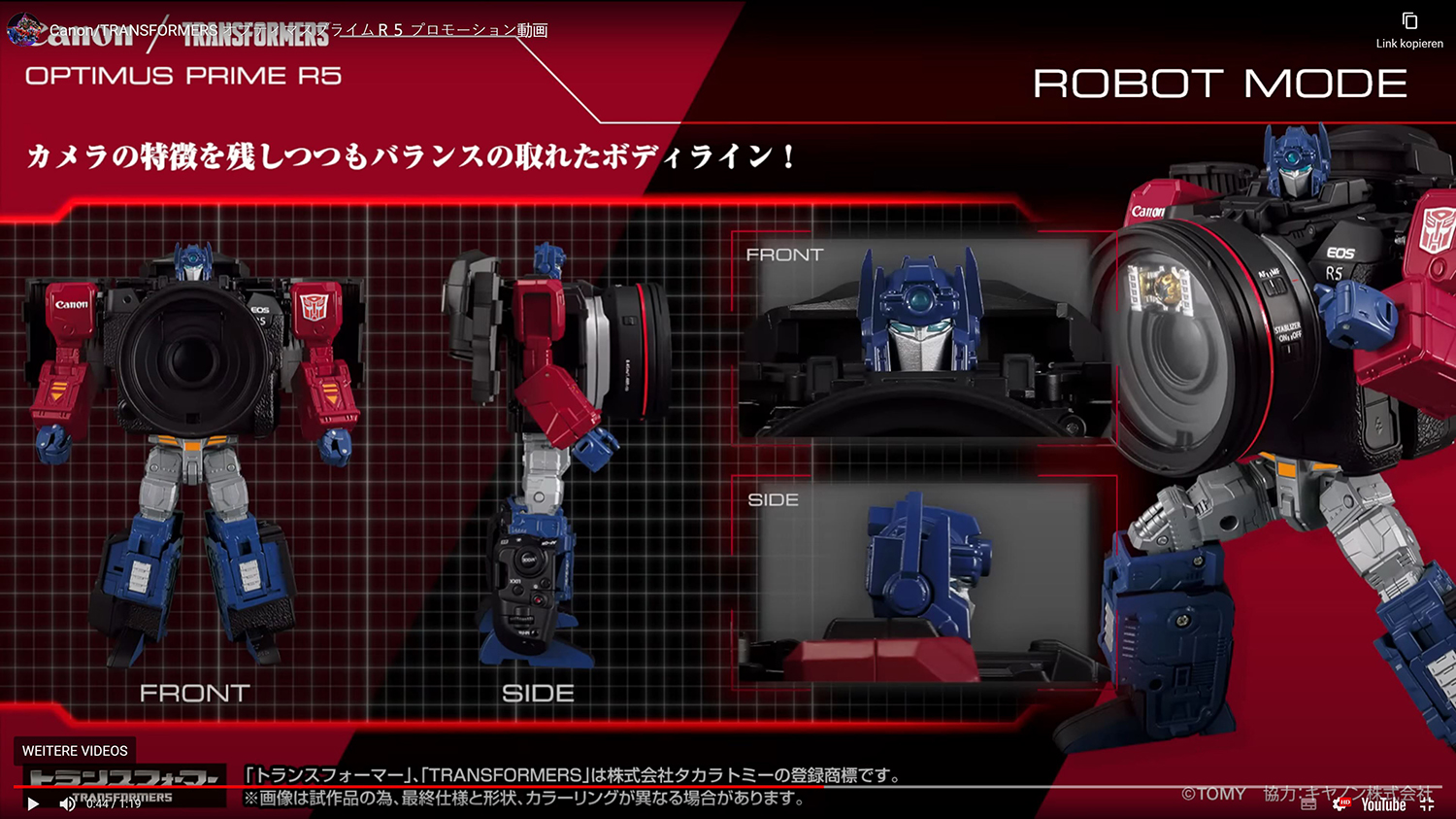 Einem Film auf YouTube ist zu entnehmen, dass aus der Canon EOS R5 zum einen „Optimus Prime“ von den Autobots wird, zum anderen „Refraktor“ von den Deceptions.
