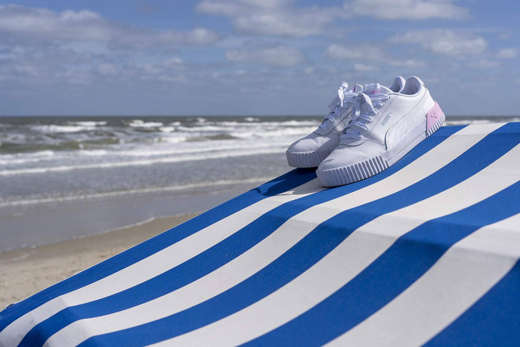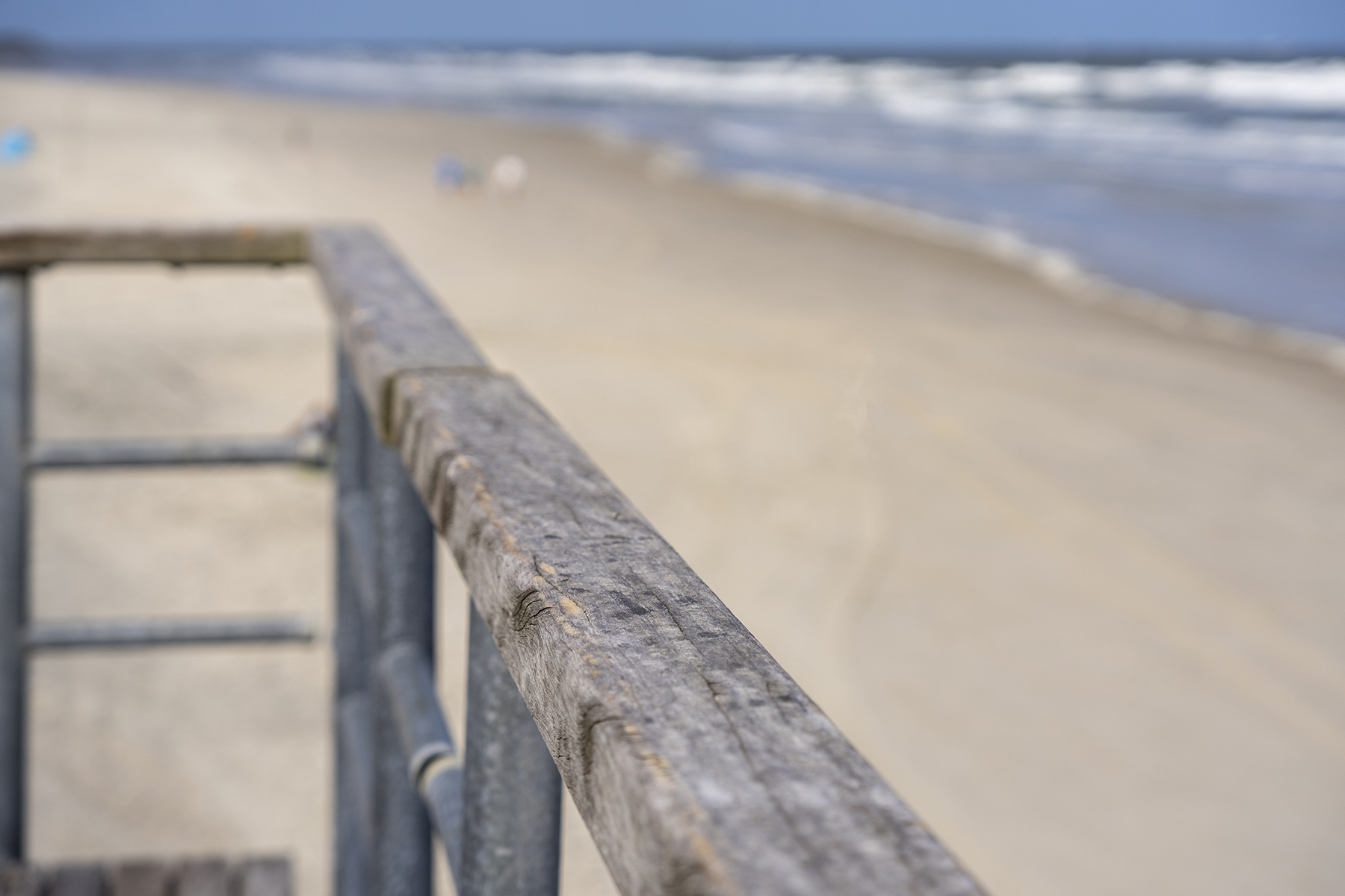 Das Geländer des „Balkons“ vor den Hüttchen mit Kiosk, Strandkorbverleih und Umkleidekabinen lädt dann zu Spielereien mit schmaler Schärfenzone mit der längsten Brennweite des 28-70 mm ein, …