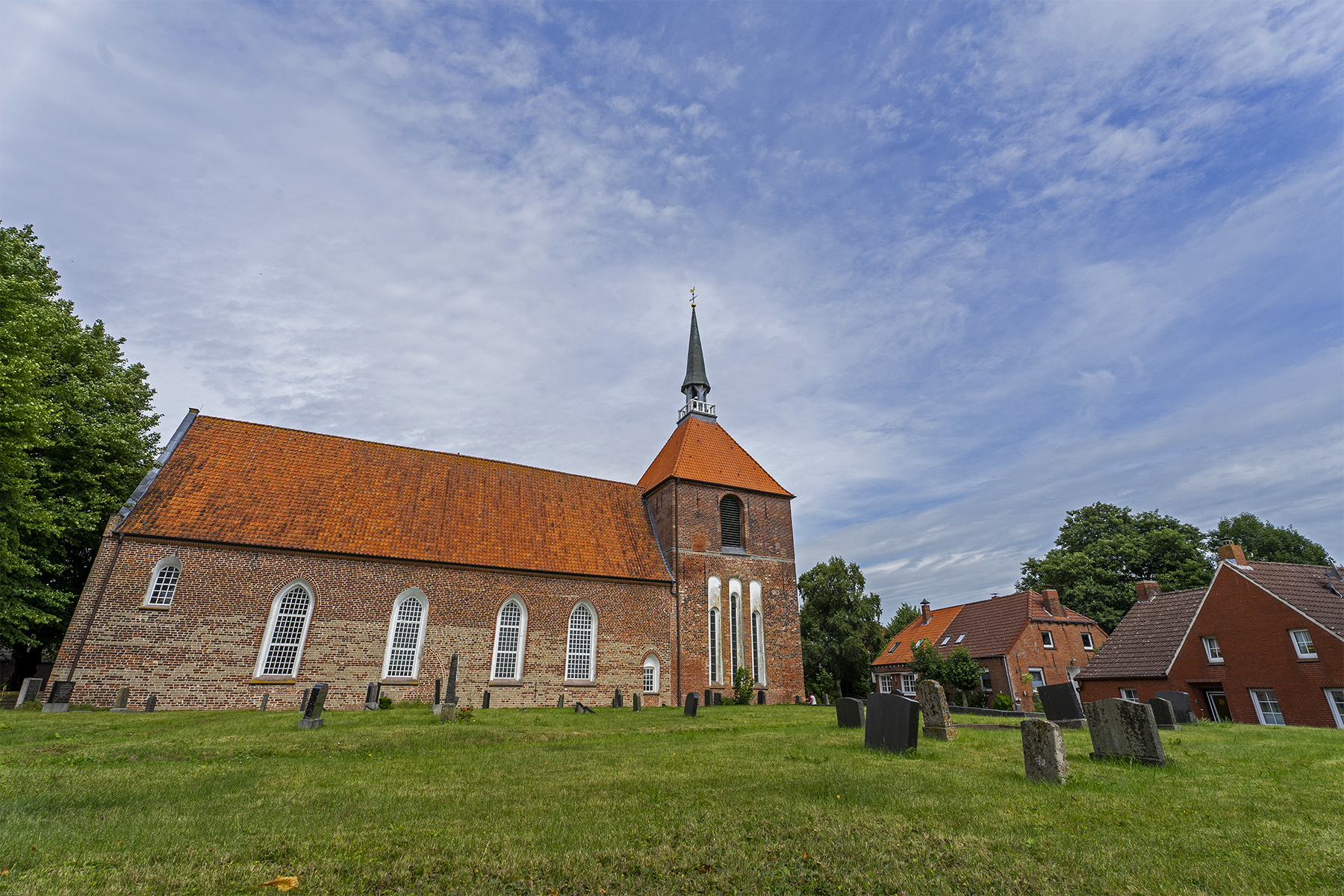 Die erste Station ist Rysum. Das Ortszentrum des malerischen Dorfes liegt erhöht auf eine Warft und das Zentrum des Zentrums bildet die wuchtige Kirche mit dem gedrungenen Kirchturm, die Stürmen trotzen kann, und der alte Friedhof mit seinen verstreut stehen Grabsteinen.