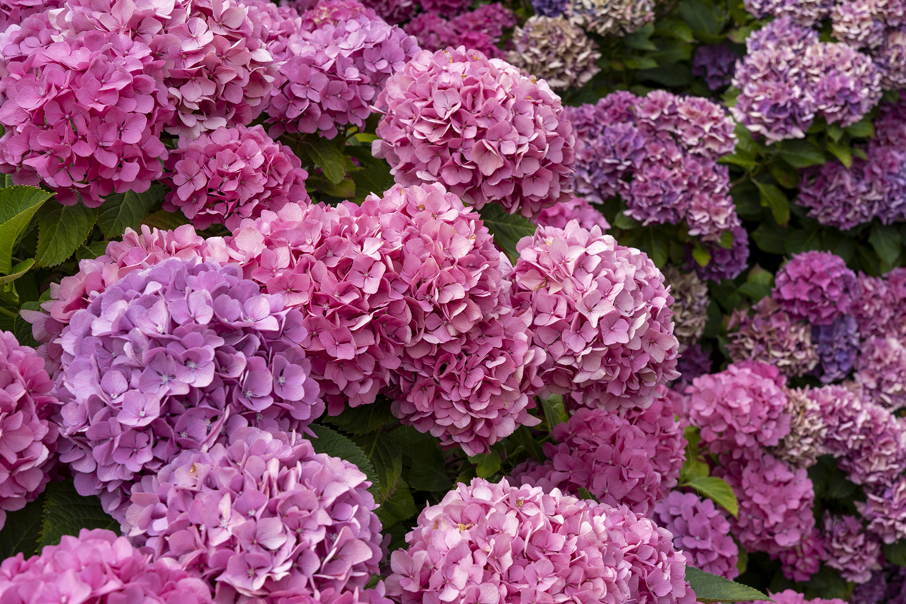 Auf dem Weg das Dorf fallen die üppig blühenden Hortensien-Büsche auf.