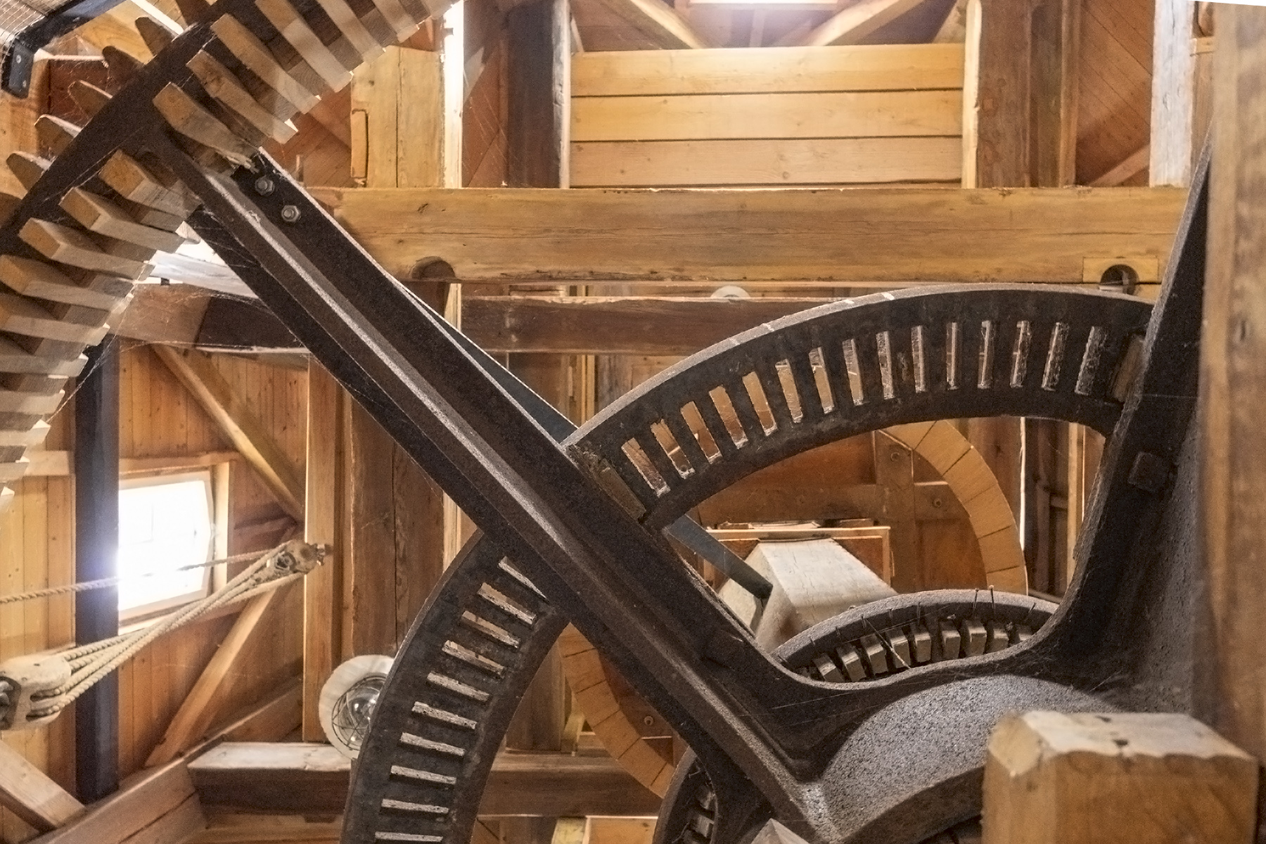 Dafür herrscht in der Mühle, die man besichtigen kann, angenehmes Licht, um die alten hölzernen Zahnräder zu fotografieren.